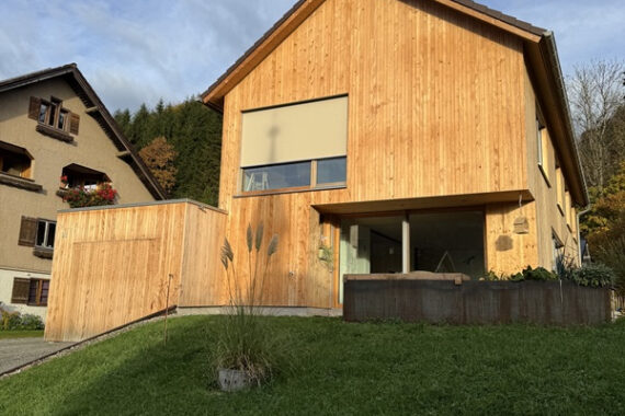 Viele Gewerke inklusive der Aussenfassade in Weißtanne wurden vom Bauherrn in Eigenleistung ausgeführt.